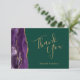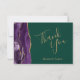Cette élégante carte de remerciements mariage moderne dispose d'une bordure en aquarelle violette ornée d'une parties scintillant en faux or. Le texte personnalisable combine les mots "Merci" en écriture manuscrite couleur or et les noms de la mariée et du marié en caractères italiques sur un arrière - plan vert émeraude. Ajoutez votre propre message personnel à l'envers.