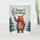 This cute winter scene features a happy brown bear wearing a cozy red scarf, standing on a snowy hill with two pine trees beside it. The bear looks super cheerful with its rosy cheeks and big smile, making it so adorable. In the sky, there are delicate white snowflakes falling, creating a peaceful winter vibe. The bear is holding a twig, adding a fun touch to the festive setting. The words "Season's Greetings" are written beautifully above the bear, making it a perfect holiday card to spread cheer and warmth. 🎅🏼🎄🎁