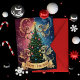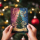 Four small dragons—two gold and two silver—joyfully decorate a Christmas tree with colorful ornaments under a swirling sky that fades from rosy pink to deep blue. The tree sparkles with baubles and garland, topped by a glowing golden star. Behind them, a dreamy background of stars and magical swirls creates a sense of wonder and enchantment, while a ribbon below the scene reads “Merry Christmas.”