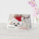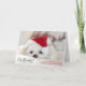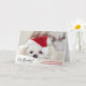 Carte de Noël avec une adorable photo d'un mignon chien blanc portant un casquette de Noël rouge. Le texte dit Bah Humbug alors que ce chien a l'air épuisé par les festivités de Noël.