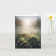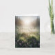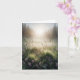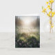 Un soleil doux filtre à travers une forêt brumeuse, illuminant un pré de délicates fleurs violettes et des vertes herbes blanc carte note.