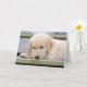 Chien d'or sur des marches en bois.