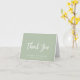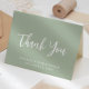 This elegant modern wedding thank you card features stylish handwriting script in white on a sage green background. Add the couple's names and wedding date in sans serif font.