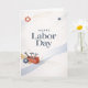 This contemporary Labor Day design features clean typography and a refined, minimalist layout. The centered “Happy Labor Day” message is set against a soft, textured background with flowing linear accents that suggest movement and progress. Subtle industrial elements—a toolbox with hand tools and small gear icons—add a modern nod to craftsmanship and hard work without visual clutter. A calm palette of navy, soft gray, warm gold, and muted red creates a polished, professional feel.