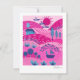 This notecard features a vibrant, stylized landscape with a whimsical and modern aesthetic. It uses a rich color palette of deep blues, vibrant pinks, and purples to create a layered, multi-dimensional scene with imaginative details, including flying fish, birds, a small sailboat, and a stylized house nestled in the hills under a pink sun. Contrast colors that give it a playful, yet sophisticated feel.