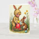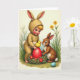 Designed with a soft, painterly spring scene, the front shows a small child in a beige bunny-style suit kneeling in the grass, long ears and a fluffy tail adding a gentle, friendly look 🐰. Beside the child, a small brown-furred woodland animal sits close, their faces angled toward each other as if sharing a quiet, affectionate discovery. In front of them rests a rustic nest made of green sprigs with tiny red blossoms tucked through it, set low among the blades of grass. Nestled inside is an oversized glossy red egg, and a tiny sun-yellow chick balances on top, drawing both characters’ wide-eyed attention. The background is filled with fresh greens, slender stems, and scattered yellow flowers that soften the scene like early morning light 🌷. A short Easter greeting appears near the top in a light sky-blue color, with smaller matching words placed neatly near the lower edge. In the foreground, a single smooth sky-blue egg sits among the green grass, catching a pale highlight along its curved side.