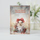 La façon la plus agréable d'envoyer des voeux de Noël à vos amis et votre famille. Un mignon poussin habillé de rouge avec une tasse de thé sur un arrière - plan en or et en bois gris. Cadre rouge où la couleur peut être modifiée