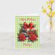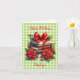Une carte Merry Bookmas personnalisée avec une belle pile de livres d'aquarelle, un gros ruban rouge et des poinsettias contre un en vichy vert. Une carte de Noël unique pour les vers de livres, les membres de la librairie et plus encore.