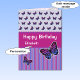 Une carte d'anniversaire moderne que vous pouvez personnaliser avec votre propre texte et le nom du destinataire. Les couleurs sont roses, lilas et bleues, et il y a des papillons coordonnés et des motifs rayés à l'avant. Tapez les cases pour changer le message sur le devant "Joyeux anniversaire", et le nom. Et changer le message à l'intérieur, ou utiliser le fourni "Souhaitez-vous aimer et bonheur dans l'année à venir".
