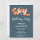 Invitation d'anniversaire avec une illustration graphique de 2 renards oranges à l'air mignon et heureux.