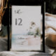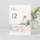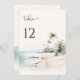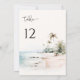 Scène de plage de l'Aquarelle tropicale, carte de numéro de table mariage. Caractéristiques, typographie noire avec des arrière - plans de couleur beige sablonneux clair.