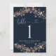 Numéro de tableau des Mariages Fleurs sauvages bleus de la Marine. Ce numéro de table de mariage élégant et élégant est orné de magnifiques Fleurs sauvages d'aquarelle peints à la main. Trouvez les objets correspondants dans la collection de rêves Fleurs sauvages bleu marine.