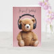 Un mignon ours en peluche brun portant un casque sur un arrière - plan rose. Tout le texte est modifiable.