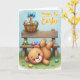 At the center of the card is a round-faced, bunny-like creature with soft brown fur, lying on its back near the bottom of the scene with curled paws, big blue eyes, and rosy cheeks that read like a shy, affectionate blush 🐰. Behind it, a rustic wooden bench supports a woven basket tied with a periwinkle-blue bow, and the two seem paired like friendly companions in the same little spring moment. The basket overflows with pastel oval eggs in pink, blue, yellow, and purple, each decorated with small patterns that add a gentle, festive rhythm. A small bright-green frog with curious eyes sits on the bench as if keeping watch, adding a quiet hint of friendship to the setting. The foreground is grassy and dewy with tiny wildflowers and a few scattered eggs, suggesting recent exploring and shared discoveries 🐇. In the upper right, the text reads “Happy 1st Easter” in a clear, dark-colored font that stands out against the pale sky. Soft light washes the scene from above, turning the sky a calm, powdery blue and leaving the bench’s wood grain and the basket’s weave lightly detailed. The periwinkle bow loops neatly over the basket rim, with one ribbon tail draping toward the eggs.