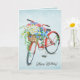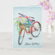 Vélo rouge avec bouquet de fleurs dans un panier sur arrière - plan turquoise texturé doux. Tout le texte peut être modifié.