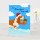 Carte de vacances de Noël mignonne avec l'illustration d'un Basset Hound, alias Basket Hound tenant un panier de Noël dans sa bouche. La corbeille a un cadeau emballé, des sucres de canne, et de petites décorations d'arbres de Noël. Il porte un chapeau de Père Noël et est prêt pour une patte. Frappes et rides mignonnes incluses ! Copyright © Shoaff Ballanger Studios, 2023.