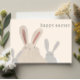 Carte Pâques mignonne, lapin aquarelle avec un accueil de Pâques heureux. Cette carte Pâques veloutée douce et jolie, neutre et colorée est élégante et simple. Les polices sont modernes et causales. Le message à l'envers indique envoyer un accueil heureux au destinataire. Customisez la carte pour remplacer votre propre nom et votre propre message par l'outil de personnalisation ou utilisez gratuitement le message déjà fourni ici. © dessin artistique Joliment Abstrait