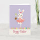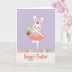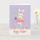 Designed with a sweet spring scene, this card features an upright bunny in a dancer’s pose at the center, set against a soft lavender background 🐰. A tiny red bow sits between its long ears, and it wears a ruffled coral-pink outfit that reads like it’s dressed up for someone special. The bunny’s gentle eyes and rosy cheeks give it a tender, friendly look, as if it’s sharing a quiet moment with the viewer. In one raised paw it balances a patterned green egg, while the other holds a woven basket filled with many decorated eggs in pastel shades. Along the lower edge, a row of small eggs forms a repeating border, each one marked with different dots, stripes, and little flourishes 🌷. Beneath that border, a wide off-white band holds a short Easter greeting centered in flowing ruby-red lettering. The lavender field stays open and uncluttered above, drawing attention to the bow, the basket, and the single green egg held aloft. Share your Easter sentiments with someone you care about, with the ruby-red greeting resting on the off-white band beneath the pastel egg border.