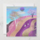 Ce magnifique paysage abstrait dépeint un paysage vallonné avec des arbres printaniers en fleurs et des oiseaux dans les tons rose, violet, beige, tan, or, vert et bleu.
