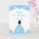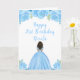 Cette carte d'anniversaire présente des fleurs florales bleu vif de parties scintillant imitation et une belle princesse à la peau foncée et une robe élégante. C'est parfait pour une fête d'anniversaire.