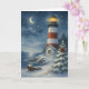 Brille une lumière sur la magie des vacances avec cette carte de Noël enchanteresse. Un phare rayé rouge et blanc brille chaleureusement sous un ciel étoilé d'hiver, avec des pins enneigés, une couronne festive et un canot décoré le long du rivage.