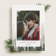 Carte de vacances en forêt de pin vert foncé et rustique conçue par Shelby Allison et pouvant être personnalisée avec une photo et un texte à l'avant ainsi qu'une photo et un message d'accueil à l'arrière.