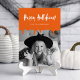 carte photo Halloween éffrayant avec "Happy Halloween" en lettres blanches. Le haut du design présente du sang orange moucheté coulant sur votre photo ci-dessous. Personnalisez le devant de la sanglante carte d'Halloween avec votre nom. L'arrière de la carte est orangé par un arrière - plan moucheté.