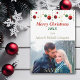 Une bordure colorée d'ornements d'arbres rouges, verts et dorés sur un arrière - plan blanc ornent le dessus de cette carte photo de Noël. Au milieu se trouve votre texte personnalisé en rouge, vert et or. La moitié inférieure est au centre de la scène avec votre propre photo. Festif et lumineux ! Le verso de la carte a la même bordure supérieure en bulbe pendante, et vous pouvez ajouter du texte supplémentaire, si vous le souhaitez, en choisissant Customiser.