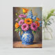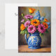 Un beau pichet bleu et blanc rempli de fleurs colorées et lumineuses est imprimé sur une carte Pensée pour Vous. Le texte peut être modifié ou supprimé. Image générée par IA par IveyCottage.
