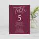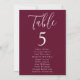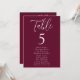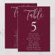 Plan de table de mariage moderne avec "Table" affiché en écriture blanche avec le numéro de table et les noms des invités indiqués ci-dessous sur un fond bordeaux. Le design se répète au verso. Pour commander le plan de table, modifiez chaque carte avec le numéro de table et les noms des invités et ajoutez-la à votre panier. Conçu pour se coordonner avec notre collection de mariage Simple Script.