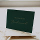 Cette délicate carte pliée dorée et verte de femme de chambre est parfaite pour un mariage moderne. Le design minimaliste romantique présente une belle et élégante typographie de champagne jaune doré sur un arrière - plan vert émeraude à l'allure simple et épurée. L'intérieur de la carte est vide pour que vous puissiez écrire à la main un message personnel.
