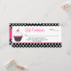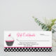 Joli certificat cadeau d'entreprise de boulangerie fait en blanc et rose avec un accent pois noir et blanc. Des graphismes fantasques d'un cupcake rose, blanc et noir décorent le côté gauche de la carte. Le texte est prêt à être personnalisé pour répondre à vos besoins professionnels. Des cartes de visite correspondants sont disponibles.