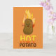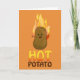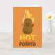 Fun dessin animé patate brune avec un grand sourire heureux, des points pour les yeux et des bâtons pour les bras. Il est entouré de flammes brûlantes jaunes et orange. En-dessous de lui en orange et en jaune est le mot HOT et en-dessous que dans le texte marron est le mot POTATO. Un design original et amusant pour rire.