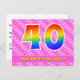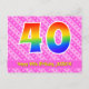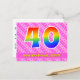 Le devant de cette carte postale de joyeux anniversaire, conçue dans un esprit affectueux, enjoué et amusant, présente un grand nombre "40" avec un motif inspiré d'un dégradé de spectre arc-en-ciel. Elle comporte également le message "Joyeux 40e Anniversaire" et un nom de destinataire modifiable. Le devant présente en outre un motif rayé rose foncé et rose clair joyeux avec des formes de cœur. Le verso comporte un message de vœux d'anniversaire personnalisé, ou pourrait éventuellement être effacé et laissé vierge si un message doit être écrit à la main à la place. Une carte postale d'anniversaire personnalisée comme celle-ci pourrait être un moyen amusant d'envoyer un message pour célébrer le quarantième anniversaire de quelqu'un. Des cartes postales comme celle-ci pourraient également être utilisées pour inviter des invités à