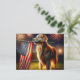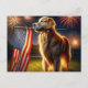Un récupérateur d'or tenant un drapeau américain avec un feu d'artifice en rétroéclairage. Tout le texte peut être modifié.