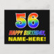 La façade de cette carte postale amusante, joyeuse et colorée à thème d'anniversaire comporte un grand nombre de "56" et le message "HAPPY BANTHDAY", tous deux colorés avec un motif inspiré par un gradient de spectre arc-en-ciel, ainsi qu'un nom de destinataire personnalisé jaune gras. L'avant est également décoré d'un arrière - plan minimaliste noir. Le verso de la carte postale contient un message de voeux d'anniversaire customisé, ou peut-être peut-être effacé et laissé vide si un message doit être écrit à la main à la place. Une carte postale d’anniversaire personnalisée comme celle-ci pourrait être une façon amusante de célébrer le cinquante-sixième anniversaire de quelqu’un. [~Z0000474]