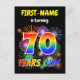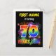 La façade de cette carte postale d'invitation de fête d'anniversaire vibrante et passionnante comporte un nom modifiable, un amusant feu d'artifice inspiré du motif, et le message "70 ANS !" avec un motif coloré à l'arc-en-ciel inspiré du spectre dégradé. Le verso comporte un message modifiable qui peut inclure des détails sur la fête d'anniversaire, comme quand elle se déroule et où elle se tient. Des cartes postales d'invitation comme celle-ci pourraient être envoyées aux invités potentiels d'une fête organisée pour célébrer l'anniversaire de quelqu'un qui a 70 ans. [~Z0000452]
