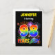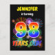 La façade de cette carte postale d'invitation d'anniversaire vibrante et amusante comporte un nom personnalisé, un feu d'artifice festif animé inspiré motif, et le message "98 ANS !" avec un motif coloré inspiré du spectre arc-en-ciel. Le verso comporte un message personnalisable qui pourrait décrire le moment et l'endroit où la partie est tenue, en plus d'autres informations pertinentes. Des cartes postales d’invitation comme celle-ci pourraient être envoyées aux participants potentiels d’une fête d’anniversaire qui se tient pour célébrer le quatre-vingt-dix-huitième anniversaire de quelqu’un. [~Z0000452]