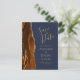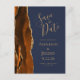 This elegant save the date postcard feobjets a burnt orange watercolor agate border trimmed with faux gold glitter. Easily customize the gold colored text on a dark navy blue background. The inverse repeats the information, along with a customizable return address