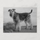 Aww...qui peut résister au visage mignon d'un chiot Airedale ? Cette charmante carte postale présente une photo en noir et blanc d'un chiot Airdale Terrier debout au bord de l'eau. Ce doux chiot Airedale est prêt à vous aider à envoyer des salutations à la famille, les amis et les clients.