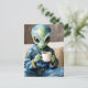 Un drôle d'Alien habillé en pjs bleus avec un café du matin extra-large