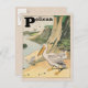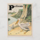 Pélican sur la plage au bord de la mer avec d'autres oiseaux volant dans l'air au milieu des falaises rocheuses au-dessus de l'océan. L'alphabet lettre P est pour "Pelican", imprimé en haut de la carte postale en caractères gras pour aider les enfants et les élèves de l'ESL à apprendre leurs ABC.