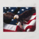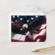 American Eagle Postcard a un aigle avec un drapeau américain derrière lui sur cette carte postale avec rouge blanc et bleu sur le drapeau.