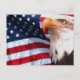 American Eagle Postcard a un aigle avec un drapeau américain derrière lui sur cette carte postale avec rouge blanc et bleu sur le drapeau.