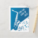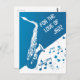 Cette carte postale présente des couleurs dominantes bleu-blanc, une illustration de saxophone plat, des notes musicales, des coeurs bleus et le texte par défaut personnalisable "pour l'amour du jazz". Un design qui plaira aux amateurs de musique et de jazz !