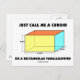 Si vous pensez en termes de cuboïdes, vous apprécierez chacun de ces cadeaux qui présentent humour mathématique et géométrique avec la phrase "Appelez-Moi Simplement Un Cuboïde Ou Un Parallélépipède Rectangle". Caractérisé par la hauteur, la longueur et la largeur. Pas besoin de réviser pour la partie mathématique du SAT ou de l'ACT ou d'être un mathématicien pour apprécier cette attitude géométrique ironique !