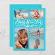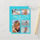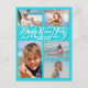 Carte postale bleu aqua brillante "Bonne année". Inclure les numéros de la nouvelle année derrière l'accueil et la signature. La plage tropicale aux palmiers est l'arrière - plan à l'envers. Ajoutez cinq photos de la famille à partager avec les proches.