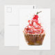une aquarelle traditionnelle d'un savoureux cupcake à l'allure crémeuse avec garniture crémeuse et une cerise sur une carte postale.