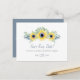 Annoncez vos fiançailles avec ma carte "save the date" aquarelle botanique de tournesol, de verdure d'eucalyptus et de bleu avec la mention "save our date" en calligraphie chic. La carte florale se retourne sur une couleur bleue complémentaire unie avec vos noms et date de mariage avec un espace prévu pour l'adressage des invités. Annonce de mariage parfaite pour les mariages de fin d'été et de jardin d'automne. Pour voir la suite de papeterie de mariage assortie, visitez VG Invites sur Zazzle
