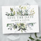 Elégante Aquarelle moderne Botanique Verdure Fiançailles Mariage Enregistrer la date La carte postale comprend les feuilles d'eucalyptus, le feuillage botanique vert, les feuilles bleus poussiéreux et d'autres belles verdure botanique. Texte vert Sage.